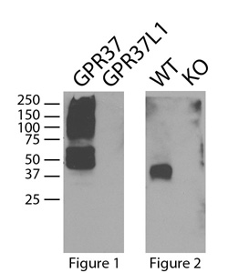 Figure 2. A western blot of wild type and GPR37 knock out tissue probed with GPR37-3 at 1:5,000 detects a band at 37 kD. (Picture courtesy of Dr. Randy Hall)
